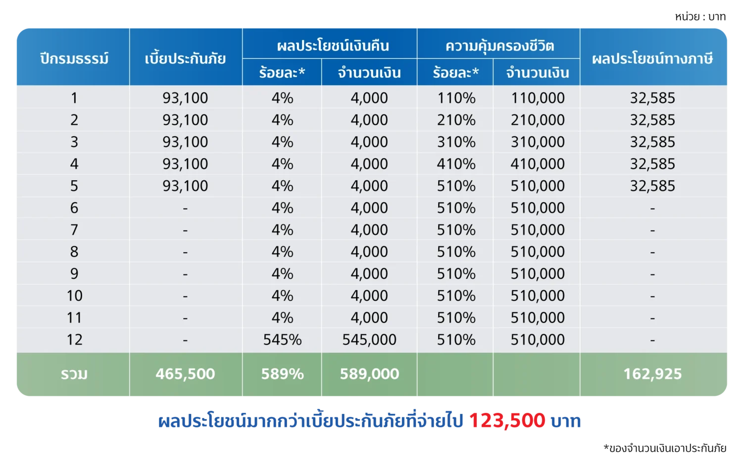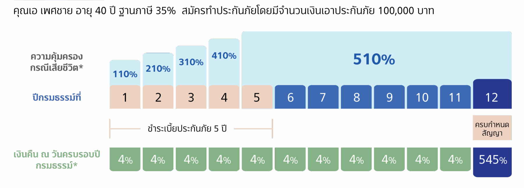 ประกันชีวิตสะสมทรัพย์ ออมเพียง 5 ปี ให้ความคุ้มครองถึง 12 ปี มีเงินคืนระหว่างสัญญา คุ้มครองชีวิตสูงสุด 512% และยังลดหย่อนภาษีได้